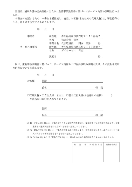 ご契約時には通所介護サービス契約書に署名・捺印をお願いしております。